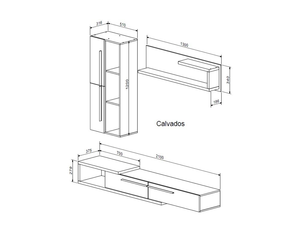 - Komponenty: TV stolek, Police, Závěsná skříňka