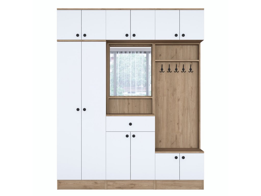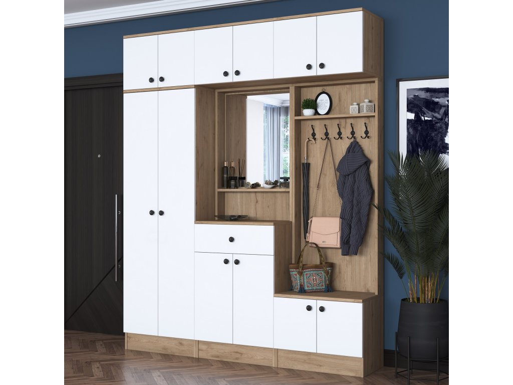 Předsíňová sestava CAPE je navržena tak, aby zajišťovala maximální funkčnost a stylový vzhled. Díky své vysoké konstrukci a kombinaci bílé barvy s dekorem ořechu dodává prostoru moderní a útulnou atmosféru. Sestava nabízí dostatek úložného prostoru a chytrých řešení pro organizaci vašich věcí.