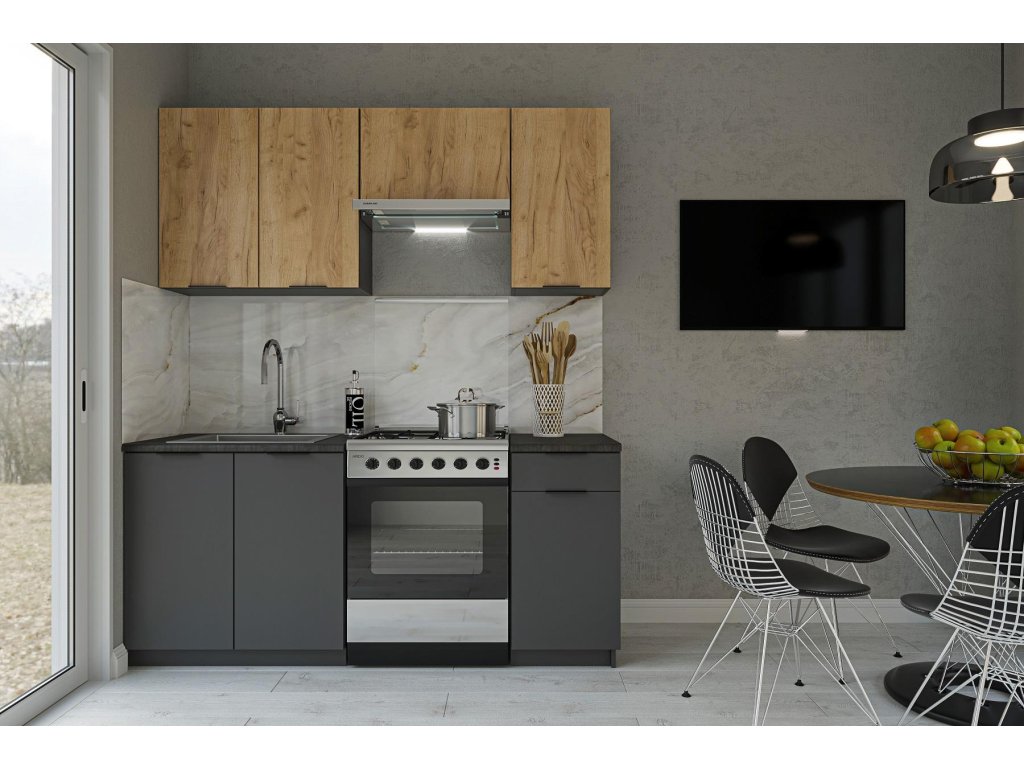 Kuchyňské skříňky jsou vyrobeny z kvalitních LTD desek. Jejich údržba je nenáročná. Korpus je v barvě grafitu. Dvířka jsou v barvě zlatý dub kraft/grafit. Úchyty jsou kovové, v černé barvě. Jsou součástí sestavy.