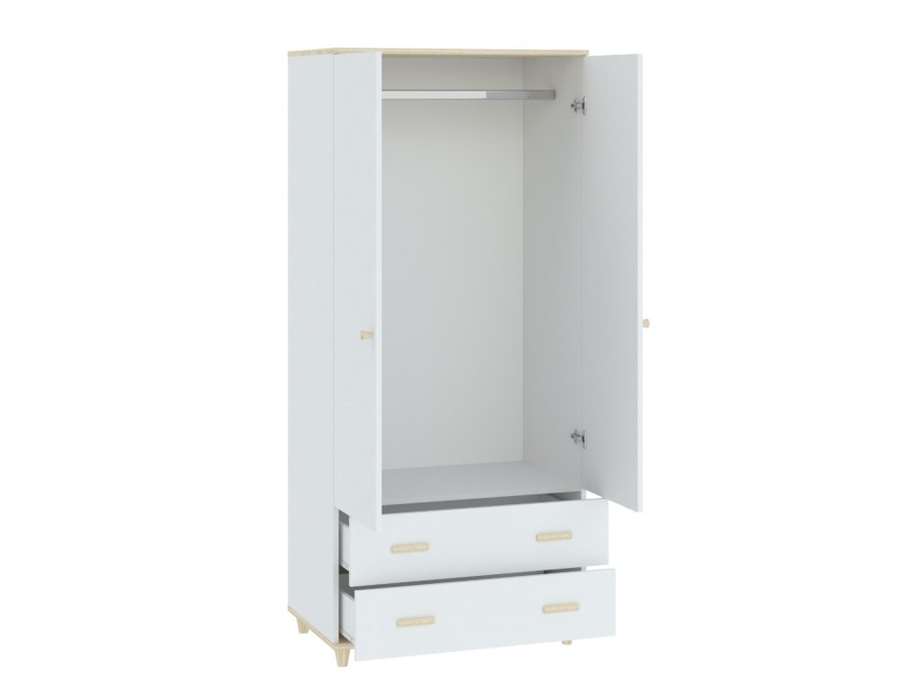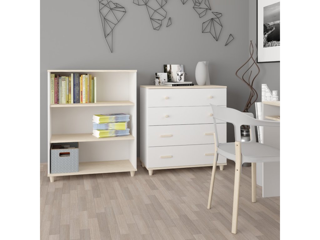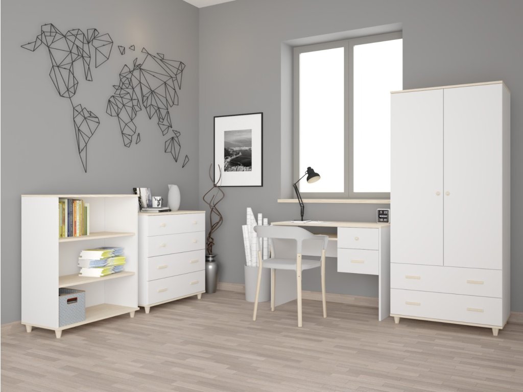 Je čas na příběhy. Naše elegantní sestava do dětského pokoje promění prostor vašeho dítěte ve velkém stylu. Ukládejte hračky, hry a pomůcky do prostorných, snadno dostupných polic, dětské oblečení do praktické šatní skříně či komody a kreslení či psaní úkolů bude zábava na moderním psacím stole. Skandi-chic design v minimalistické bílé a přírodní barvě akácie se hodí k většině dekorů.