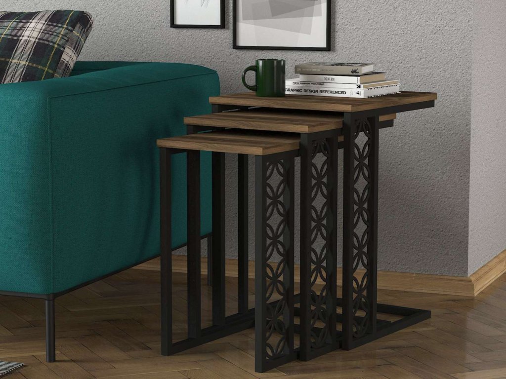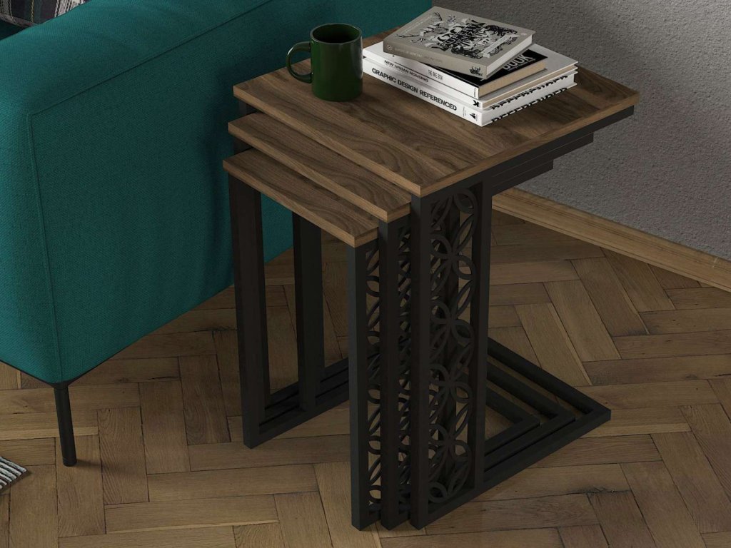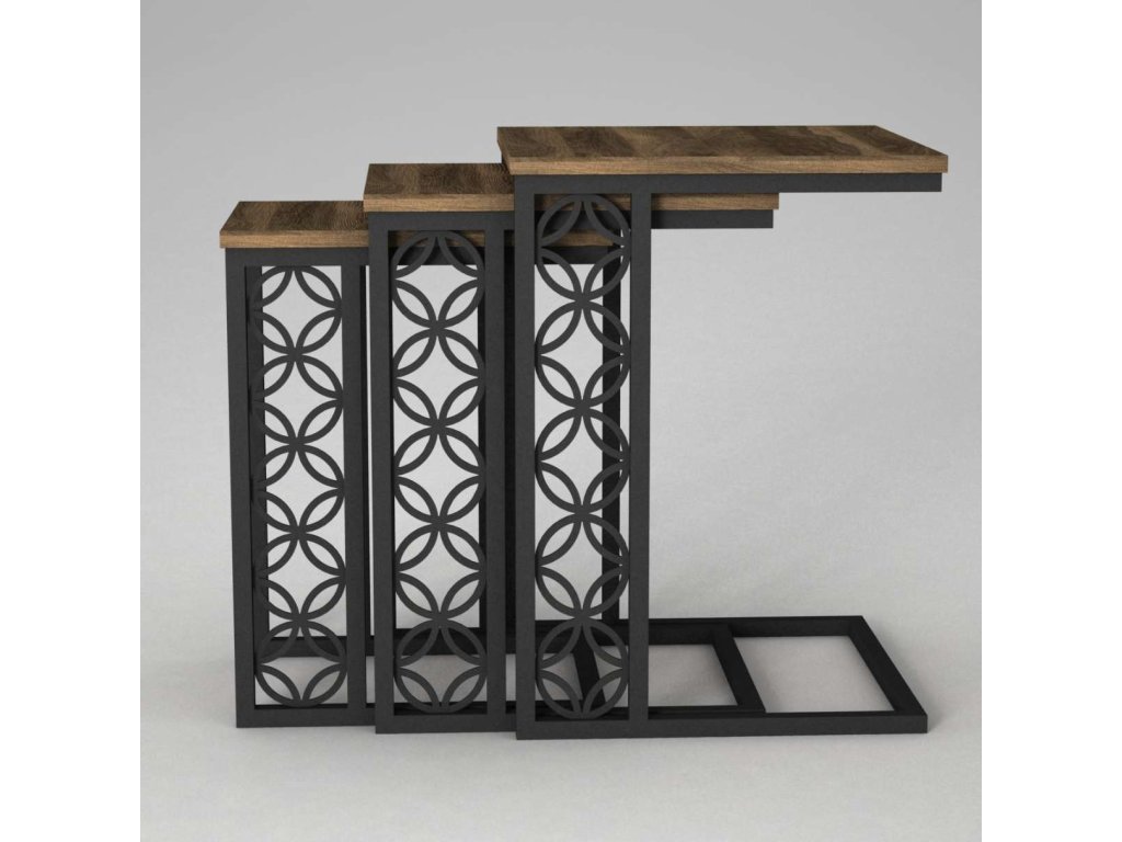 Stolek CLARK vyniká svým ořechovým provedením a obdélníkovým tvarem, který je nejen praktický, ale i esteticky atraktivní. Sestava obsahuje tři příruční stolky různých velikostí, které poskytují dostatek prostoru pro vaše knihy, časopisy nebo dekorace. Kombinace LTD materiálu o tloušťce 18 mm a kovu zajišťuje pevnost a dlouhou životnost tohoto stolku.