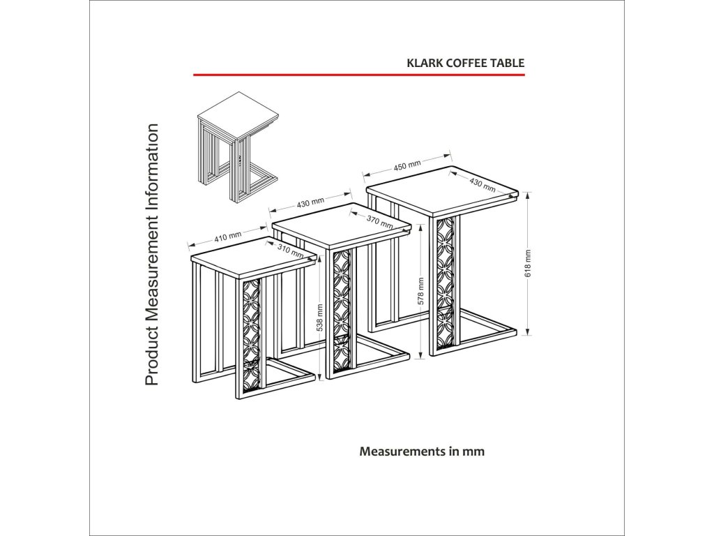 - Sestava obsahuje: 3x příruční stolek - velký 45 x 43 x 61.8 cm, střední 43 x 37 x 57.8 cm, malý 41 x 31 x 53.8 cm