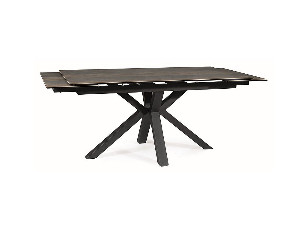 Konstrukce stolu je vyrobena z kovu v černé barvě. Deska stolu je vyrobena v kombinaci skla a španělské keramiky. Barevné provedení: hnědá s efektem dřeva.
