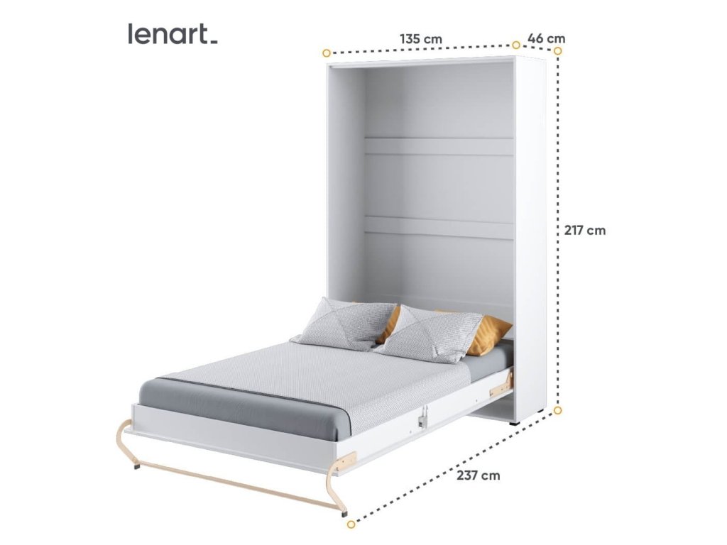 Vysoká výklopná postel 120 bílá lesk/bílá mat. Korpus nábytku je v matné bílé barvě, čelo nábytku je v bílém lesku. Rozměry viz obrázek. Každý kus nábytku v novém provedení Vám umožní dokonale zařídit menší ložnici nebo obývací, dětský či studentský pokoj. Se sklápěcí postelí Vás už nebude trápit malý prostor Vaší domácnosti. Díky stabilní konstrukci zaručuje pohodlný odpočinek. Bezpečnost je velmi důležitá a tak má naše sklápěcí postel mechanismus, kterým zablokujete postel proti samovolnému otevření. Při sklápění postele FUNKCE STOP zajistí bezpečné otevírání i zavírání. Tento výjimečný systém Vám umožní manipulaci pouze jedním prstem. Když je postel sklopená, vypadá jako běžná skříň. Vyklopením se vytáhne celá šířka postele. Při rozložení postele má hloubku 237 cm. Rám je nutno přišroubovat ke zdi, nosnost postele je 150 kg. Rošt postele je v ceně, matrace není součástí, je potřeba ji dokoupit. Doporučujeme velikost 120 x 200 x výšku do 18 cm. Po sklopení postele vzniká prostor pod postelí o výšce 20,4 cm. Nábytek je vyroben z kvalitního lamina s ABS hranou. Lamino je odolné proti poškrábání, poškození, vlhkosti a vysokým teplotám. Postel nabízíme v několika velikostech a barevných provedeních. Dodáváme v demontovaném stavu. Můžete si prohlédnout prezentační video, klikněte ZDE.