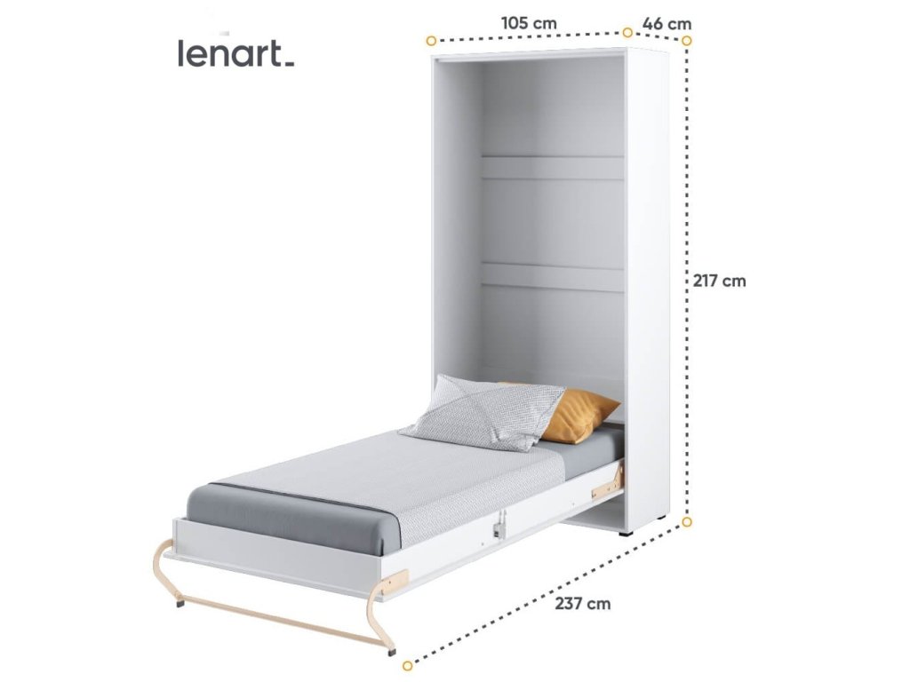 Vysoká výklopná postel 90 bílá lesk/bílá mat. Korpus nábytku je v matné bílé barvě, čelo nábytku je v bílém lesku. Rozměry viz obrázek. Každý kus nábytku v novém provedení Vám umožní dokonale zařídit menší ložnici nebo obývací, dětský či studentský pokoj. Se sklápěcí postelí Vás už nebude trápit malý prostor Vaší domácnosti. Díky stabilní konstrukci zaručuje pohodlný odpočinek. Bezpečnost je velmi důležitá a tak má naše sklápěcí postel mechanismus, kterým zablokujete postel proti samovolnému otevření. Při sklápění postele FUNKCE STOP zajistí bezpečné otevírání i zavírání. Tento výjimečný systém Vám umožní manipulaci pouze jedním prstem. Když je postel sklopená, vypadá jako běžná skříň. Při rozložení postele má hloubku 237 cm. Vyklopením se vytáhne celá šířka postele. Rám je nutno přišroubovat ke zdi, nosnost postele je 100 kg. Rošt postele je v ceně, matrace není součástí, je potřeba ji dokoupit. Doporučujeme velikost 90 x 200 x výšku do 18 cm. Po sklopení postele vzniká prostor pod postelí o výšce 20,4 cm. Nábytek je vyroben z kvalitního lamina s ABS hranou. Lamino je odolné proti poškrábání, poškození, vlhkosti a vysokým teplotám. Postel nabízíme v několika velikostech a barevných provedeních. Dodáváme v demontovaném stavu. Můžete si prohlédnout prezentační video, klikněte ZDE.