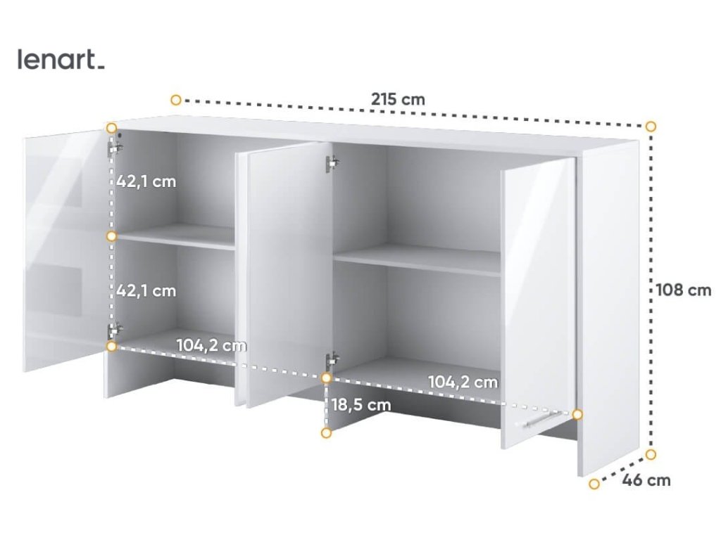 Nádstavec bílá lesk k výklopné posteli ze sektoru CONCEPT PRO. Rozměry viz obrázek. Nádstavec má 4 dvířka. Nábytek je vyroben z kvalitního lamina s ABS hranou. Korpus je v bílé matné barvě a dvířka jsou v bílém lesku. Lamino je odolné proti poškrábání, poškození, vlhkosti a vysokým teplotám. Dodáváme v demontovaném stavu.Doplňkové parametry