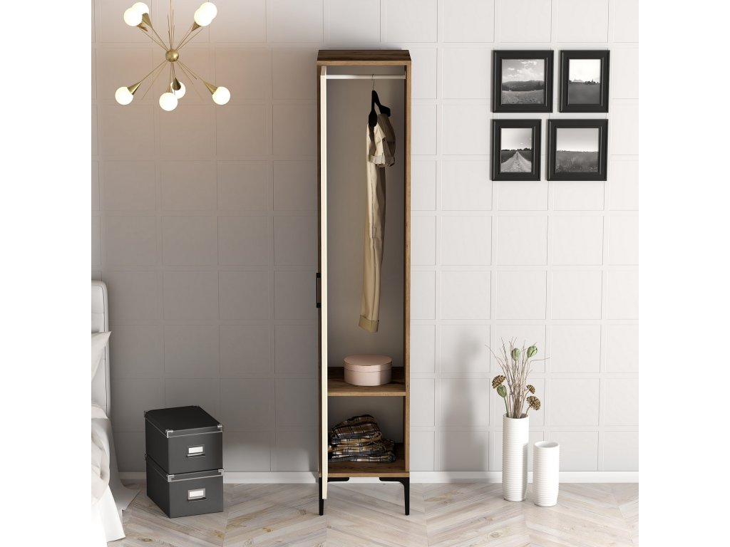 Naše šatní skříň je nejen praktická, ale také dodává vašemu pokoji nádech sofistikovanosti. Kombinace barvy ořechu a krémové barvy vytváří vizuálně příjemný kontrast, který doplní jakýkoli interiér. Proměňte svůj pokoj ve stylové útočiště s naší šatní skříní.
