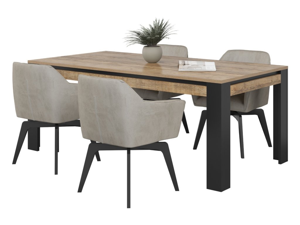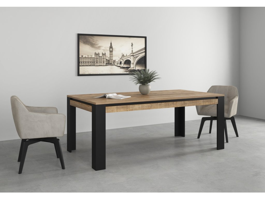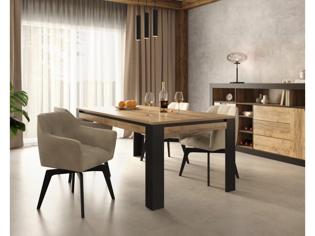 Jídelní stůl COOP je skvělou volbou pro moderní jídelny i obývací prostory. Jeho obdélníkový tvar a velká plocha umožňují pohodlné stolování až pro 8 osob. Spojení dubového dekoru s černými prvky dodává interiéru nadčasový a elegantní vzhled.