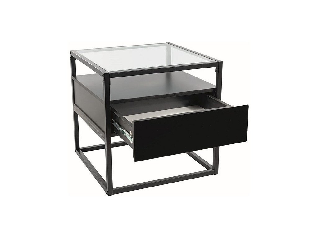 Stolek je vyroben z tvrzeného skla v kombinaci s MDF deskami, které jsou nenáročné na údržbu. Konstrukce je kovová, v černém barevném provedení.