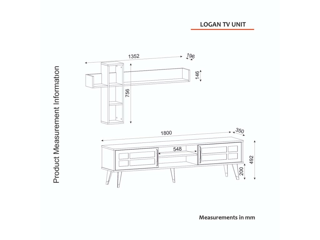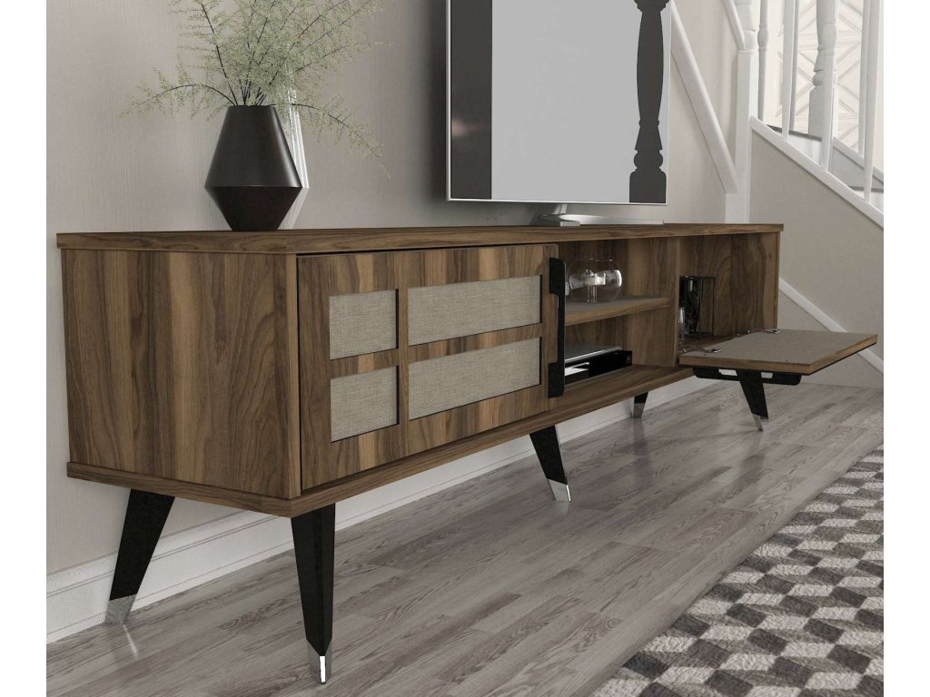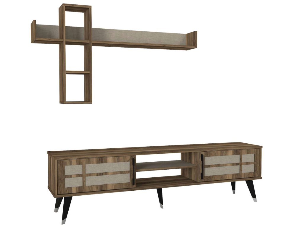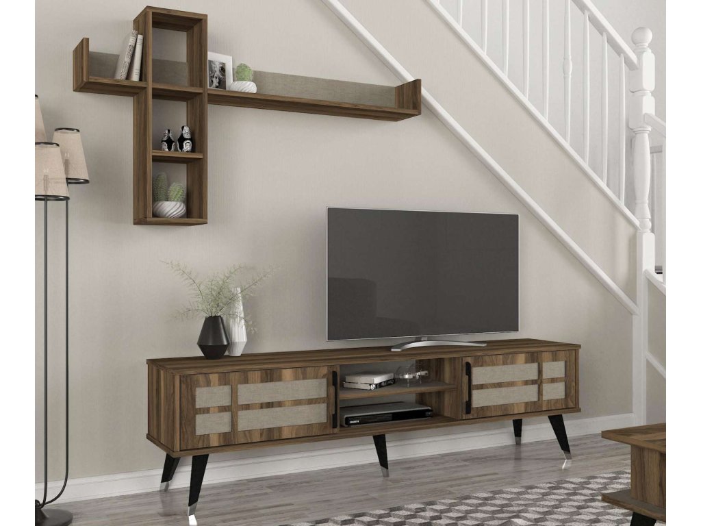 - Rozměry: TV stolek (180 x 35 x 49,2 cm) a horní modul (135,2 x 19,68 x 75,6 cm), poskytující dostatečný úložný prostor a zároveň sloužící jako dekorativní prvek.