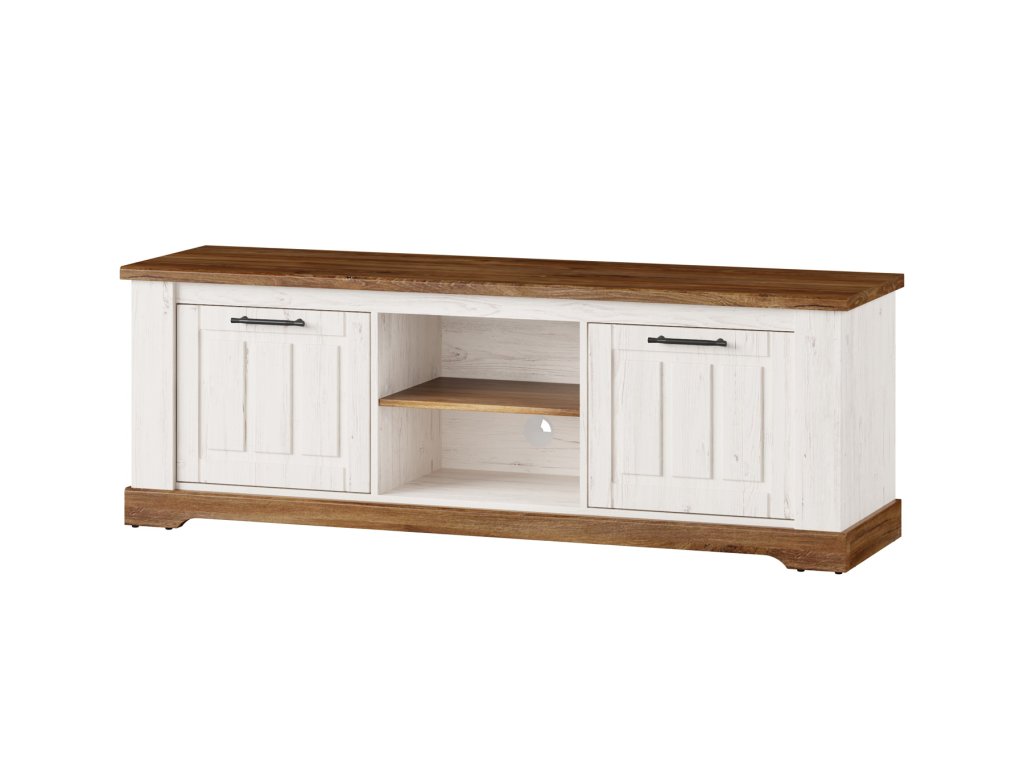 Široký 2dveřový stolek pod televizor COUNTY ve velmi oblíbeném vintage & provensal stylu. Dvířka nábytku jsou vyrobena z odolné MDF desky s vysokým leskem v barvě dub stirling v kombinaci s borovicí andersen. Korpus nábytku je vyroben z kvalitní LTD desky, která je potažena odolnou fólií a je snadná na údržbu. Úchytky jsou z kovu v černé barvě. Ke stolku je možné dokoupení dalších elementů z téhož sektoru, čímž si můžete sestavit obývací pokoj nebo jídelnu podle svých představ a potřeb. Dodáváme v demontovaném stavu.Doplňkové parametry