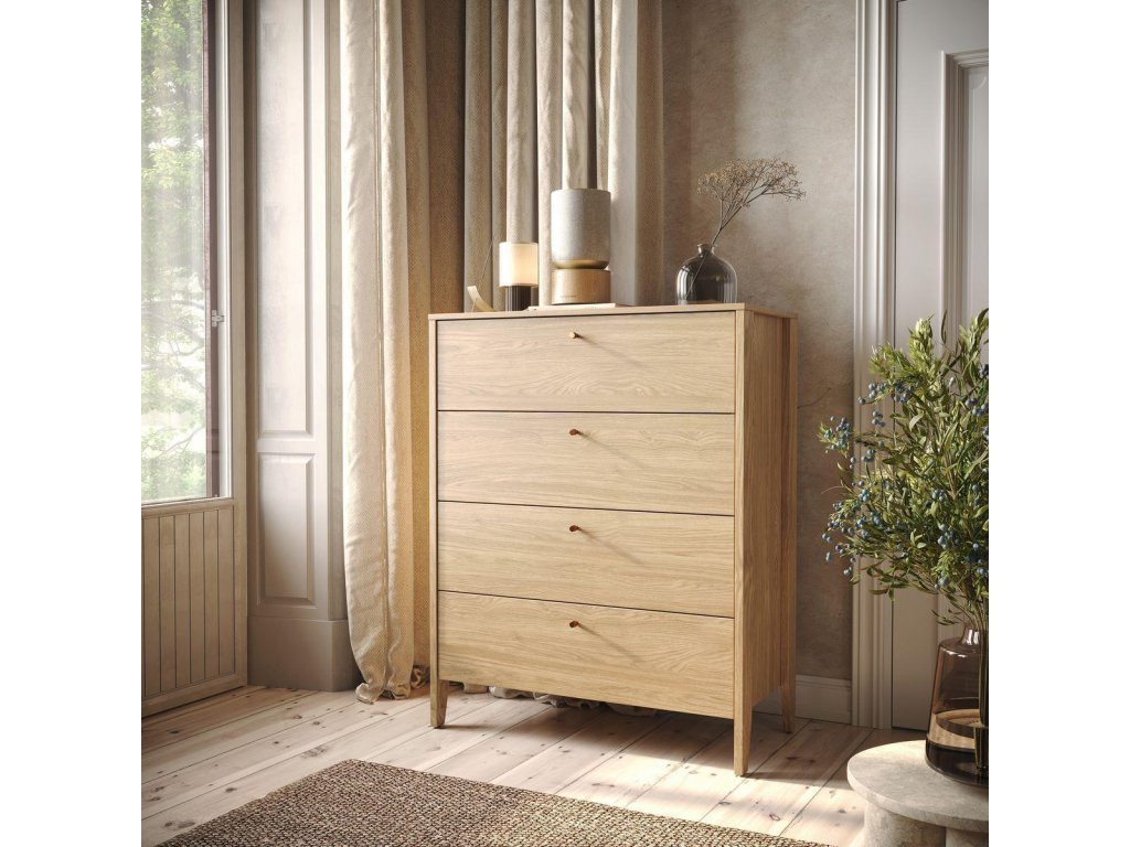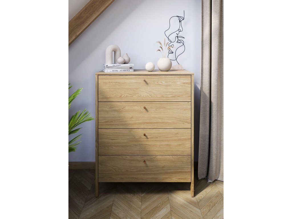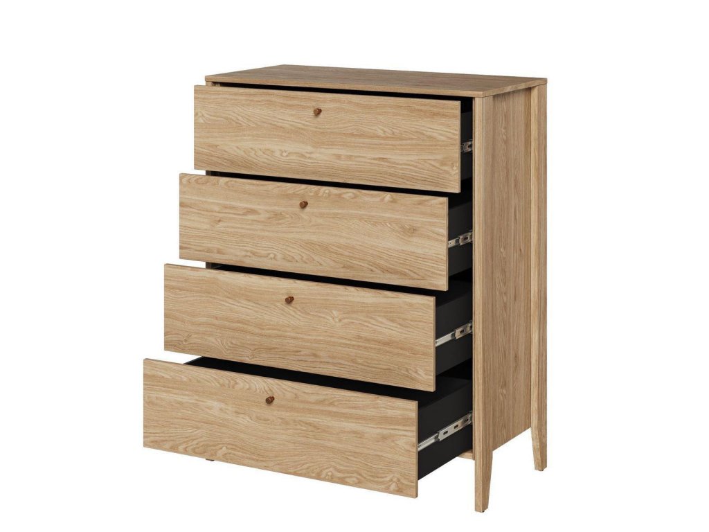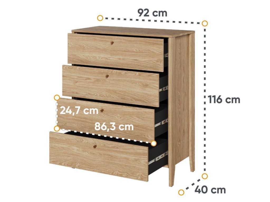 Komoda se čtyřmi zásuvkami. Kolekce je příkladem pohodlí, funkčnosti a nadčasového designu. Každý kus nábytku v této kolekci je vyroben z kvalitních materiálů, které zaručují dlouhou životnost a zároveň vnášejí do vaší ložnice teplý a útulný vzhled. Díky jemným detailům, jako jsou prodyšná čela postelí, praktické úložné prostory a moderní kovové úchyty, je každý prvek navržen tak, aby byl nejen krásný, ale i maximálně funkční. Elegantní dekor v barvě olejovaného dubu dodávají nábytku přirozený vzhled, který se snadno kombinuje s různými styly. S tímto nábytkem si vytvoříte ložnici, která bude dokonale ladit s vaším životním stylem. Dodáváme v demontovaném stavu.