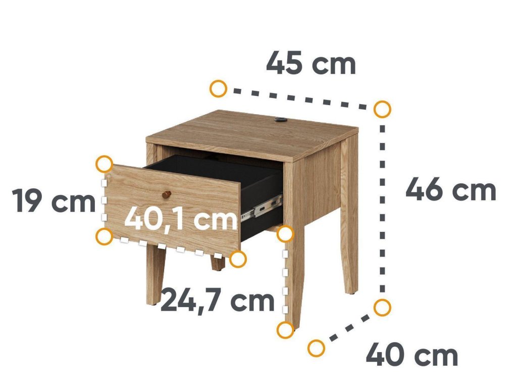 Tento noční stolek je ideálním společníkem pro vaši ložnici. S jednou prostornou zásuvkou na drobnosti a integrovanými vstupy pro nabíjení (USB a USB-C), je nejen praktický, ale i moderní. Kolekce je příkladem pohodlí, funkčnosti a nadčasového designu. Každý kus nábytku v této kolekci je vyroben z kvalitních materiálů, které zaručují dlouhou životnost a zároveň vnášejí do vaší ložnice teplý a útulný vzhled. Díky jemným detailům, jako jsou prodyšná čela postelí, praktické úložné prostory a moderní kovové úchyty, je každý prvek navržen tak, aby byl nejen krásný, ale i maximálně funkční. Elegantní dekor v barvě olejovaného dubu dodávají nábytku přirozený vzhled, který se snadno kombinuje s různými styly. S tímto nábytkem si vytvoříte ložnici, která bude dokonale ladit s vaším životním stylem. Dodáváme v demontovaném stavu.