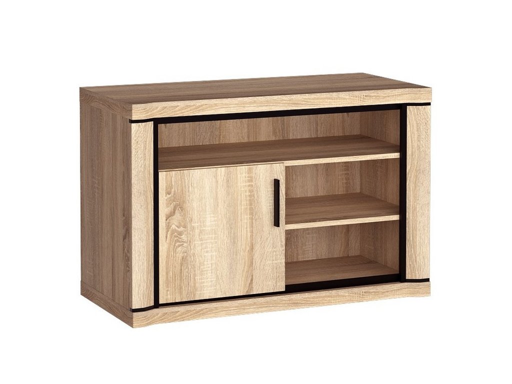 Televizní stolek s poličkami a jedny dvířky. Má zajímavé provedení v podobě netradičně vyřezávaných vrchních a spodních desek. Systém je exkluzivní kolekce navržena v moderním duchu. Celá řada se vyznačuje masivním vzhledem a jednoduchými tvary. Nábytek je vyroben z kvalitního LTD s lištami z MDF, součástí nábytku jsou desky 48 mm, vše opatřeno ABS páskou. Barevné provedení - dub sonoma. Má široký výběr komponentů, díky kterým lze vybavit nejen obývací pokoj, ale i jídelnu nebo kancelář. Dodáváme v demontovaném stavu.Doplňkové parametry