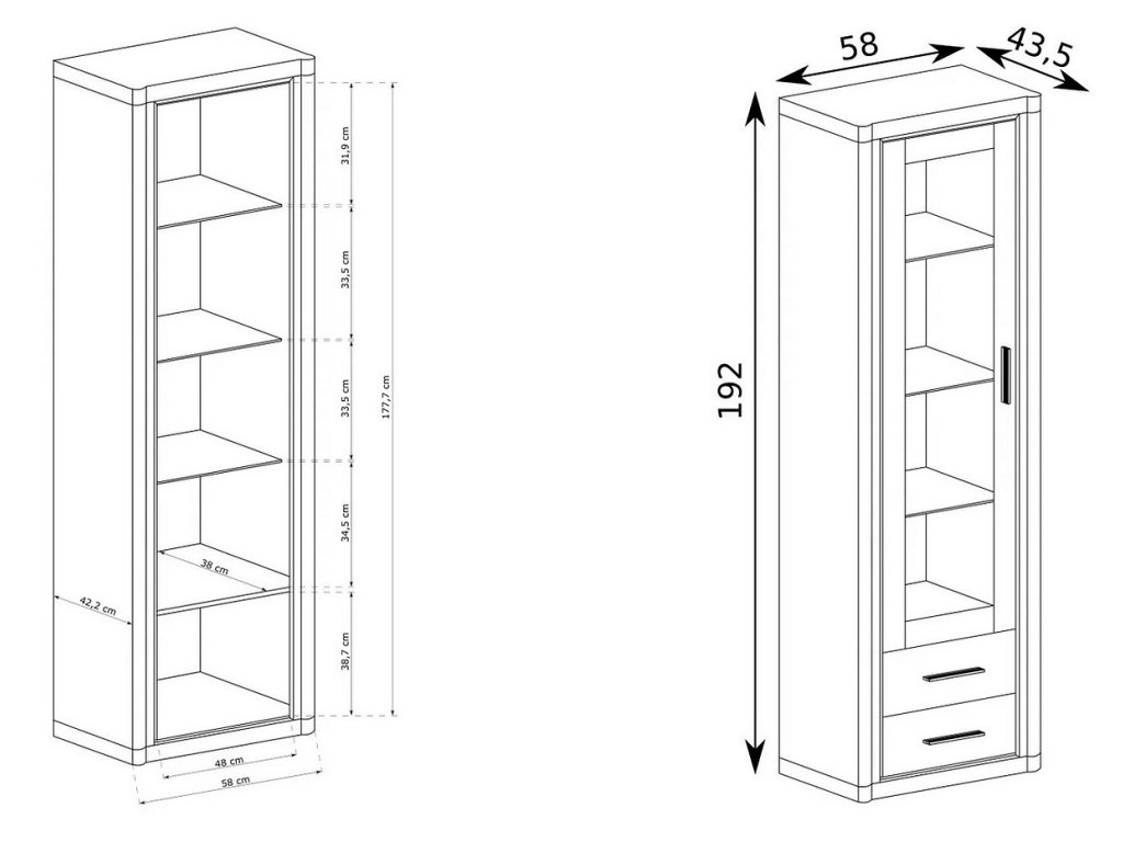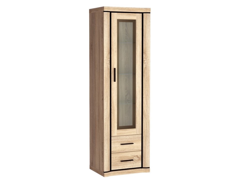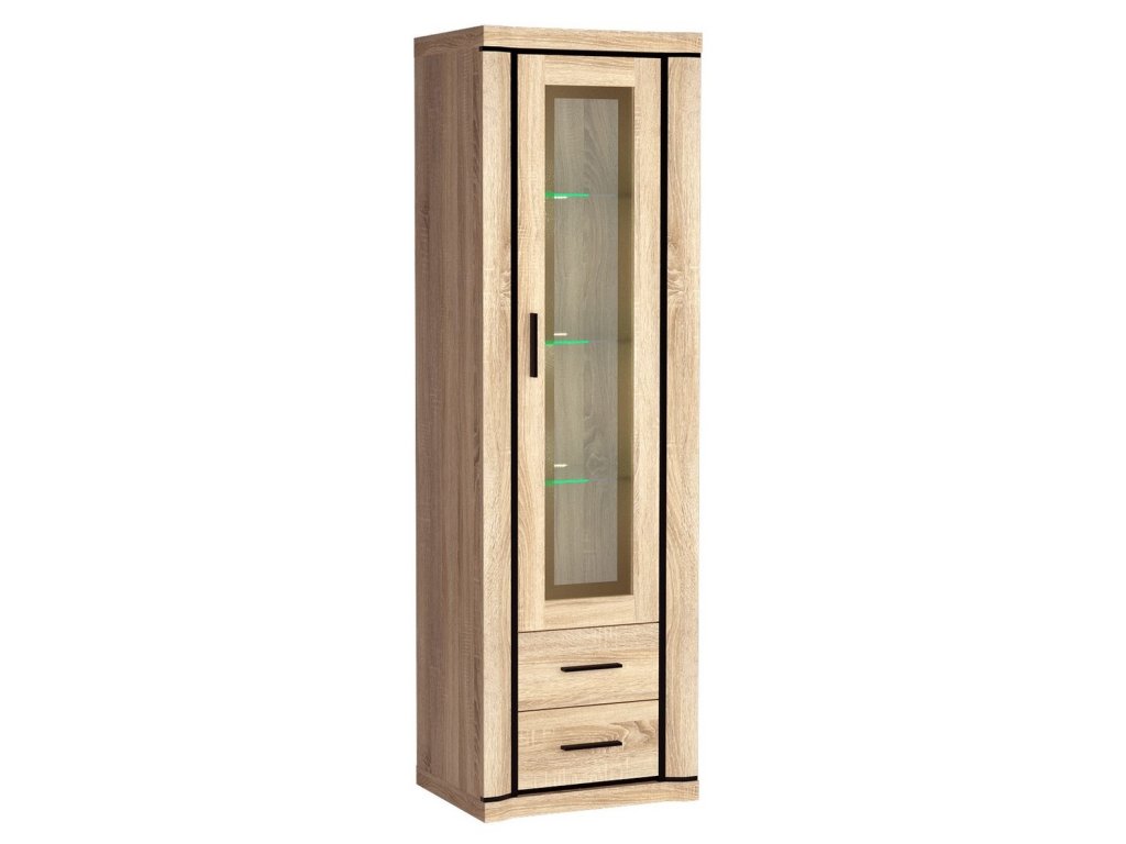 Vitrína 1-dveřová ze sektorové řady má prosklené dveře, za nimi jsou 3 skleněné poličky, dole jsou dvě zásuvky. Má zajímavé provedení v podobě netradičně vyřezávaných vrchních a spodních desek. Systém je exkluzivní kolekce navržena v moderním duchu. Celá řada se vyznačuje masivním vzhledem a jednoduchými tvary. Nábytek je vyroben z kvalitního LTD s lištami z MDF, součástí nábytku jsou desky 48 mm, vše opatřeno ABS páskou. Barevné provedení - dub sonoma. Má široký výběr komponentů, díky kterým lze vybavit nejen obývací pokoj, ale i jídelnu nebo kancelář. Vitrína má univerzální otvírání dvířek. Dodáváme v demontovaném stavu.Doplňkové parametry