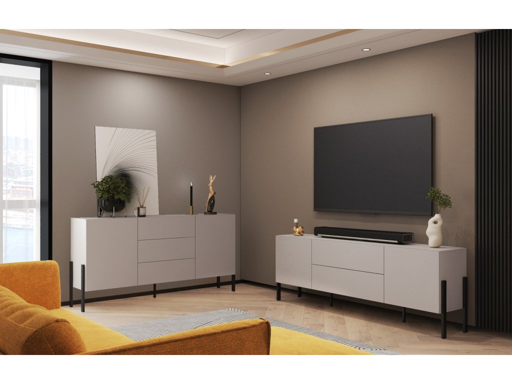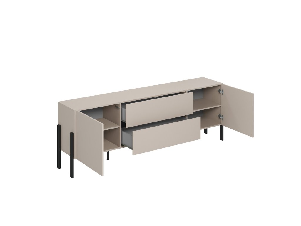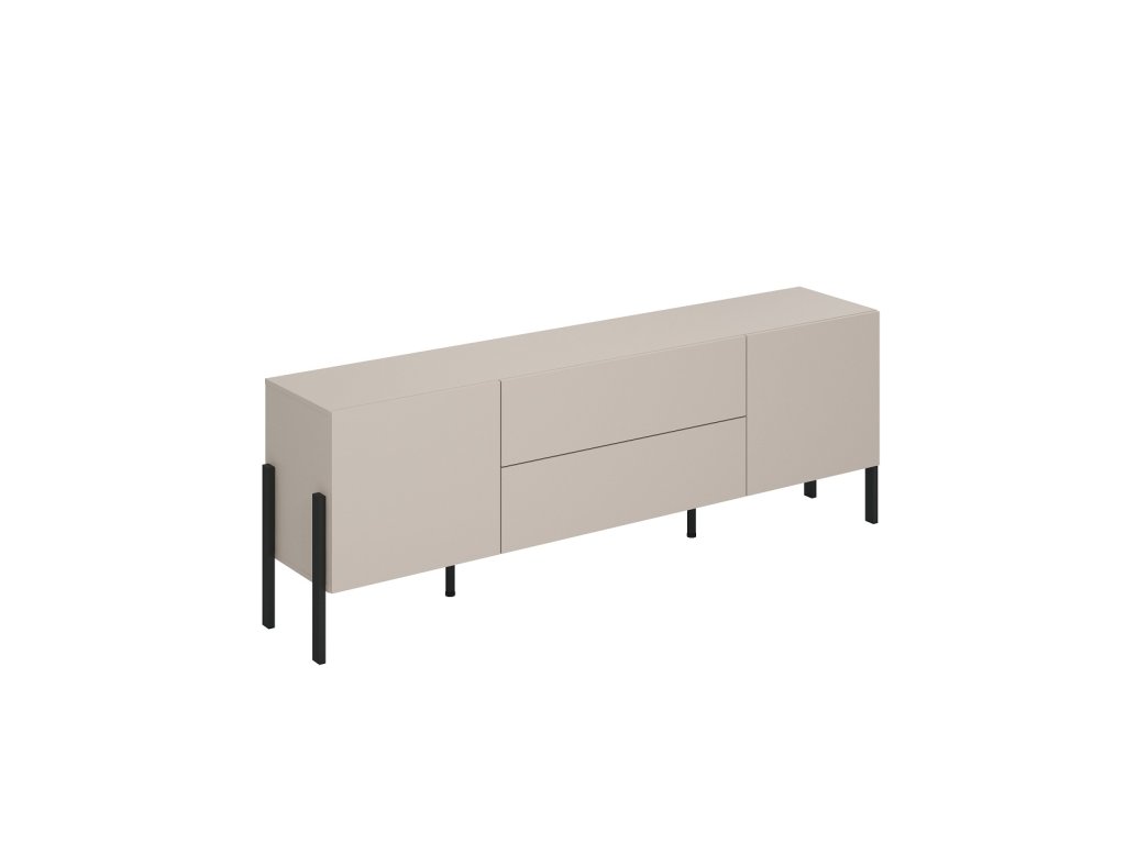Televizní stolek je dvoudveřový. Disponuje dvěma praktickými zásuvkami.