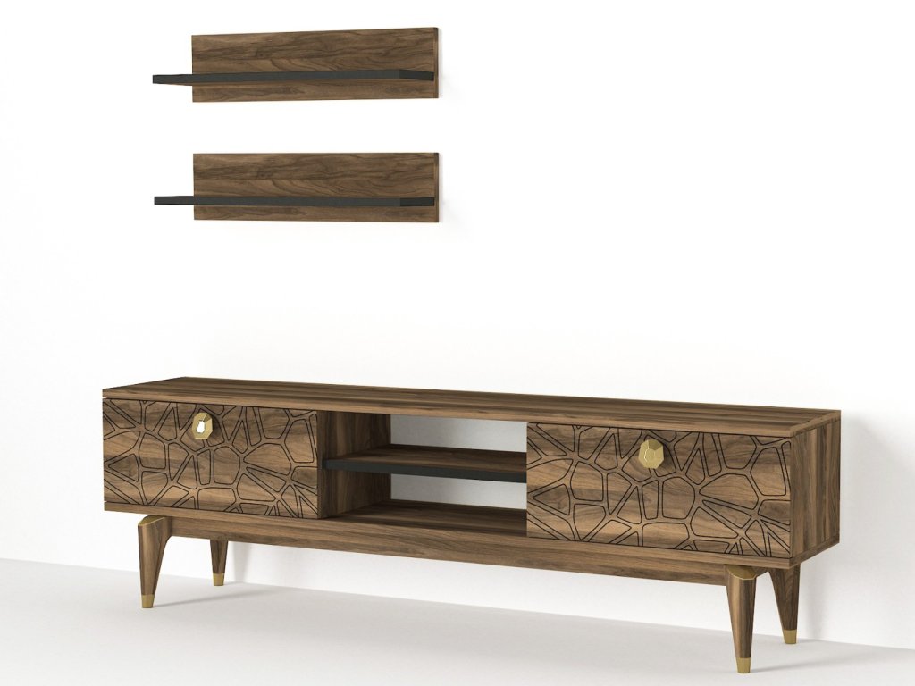 Designová TV stěna DELUXE ROYAL vás díky svému netradičnímu provedení přenese do světa orientu a pohádek tisíc a jedné noci. Tento nábytek je charakteristický výraznou kresbou dřeva, která je doplněna orientálními prvky na dvířkách a stylovými zlatými úchyty a nožičkami se zlatými prvky. TV skříňka poskytuje dostatek úložného prostoru ve formě otevřených polic i zavřených výklopných skříněk. Bonusem jsou také závěsné police v ceně TV stolku, které Vám poskytnou prostor pro vystavení dekorací či knih.