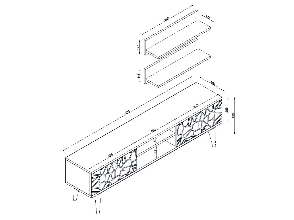 Rozměry TV stolku: (š/v/h) 150 x 45,5 x 30 cm (další rozměry v nákresu)