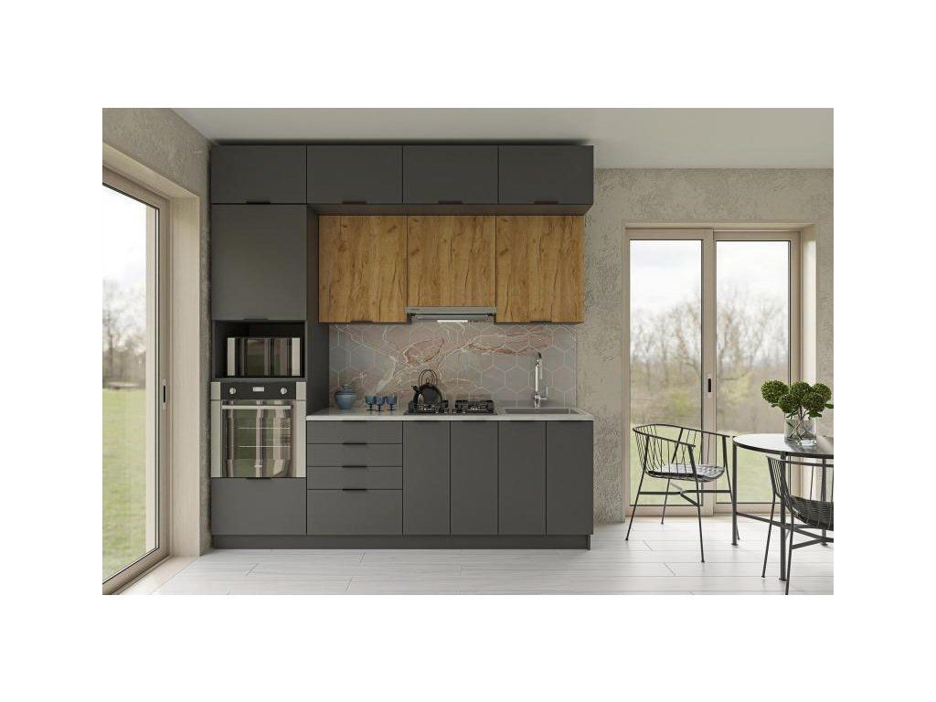 Kuchyňské skříňky jsou vyrobeny z kvalitních LTD desek. Jejich údržba je nenáročná. Korpus je v barvě grafitu. Dvířka jsou v barvě grafitu s dubem craft. Úchyty jsou plastové.