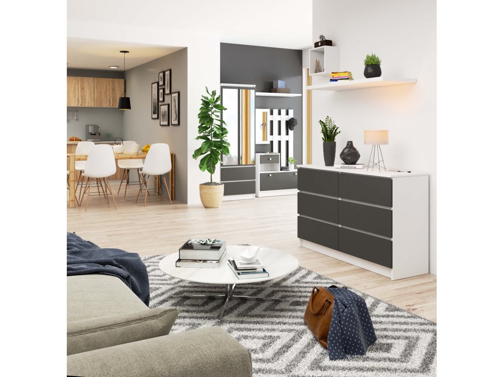 Oživte svůj obývací prostor s komodou SOPHIE120. Tato designová skříňka spojuje jednoduchost bílé s noblesou šedé, což vytváří dokonalý harmonický vzhled vhodný pro každý moderní interiér.