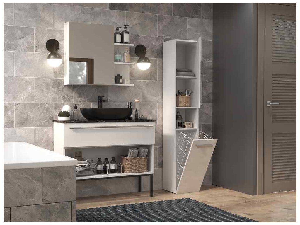 Skříňka NEL III má rozměry 174 x 31 x 30 cm a je vybavena jedněmi dveřmi a třemi policemi. Nabízí dostatek místa pro vaše koupelnové potřeby. Integrovaný koš na prádlo a praktické odkládací police přidávají skříňce další úroveň pohodlí a organizace.
