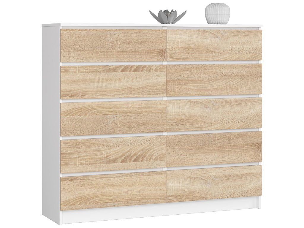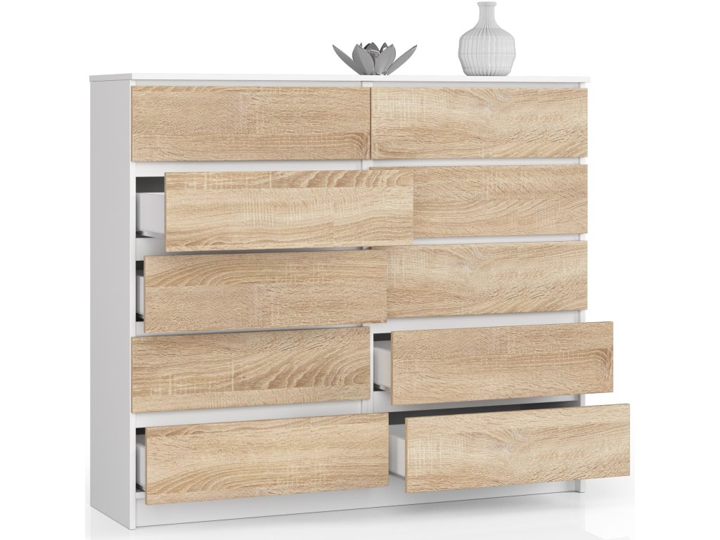 Setkání elegance a funkčnosti - tak by se dala popsat komoda AGÁTA140. Toto mistrovské dílo nábytkářského designu v kombinaci bílé barvy s přírodním odstínem dubu Sonoma dokonale doplní vaši ložnici či obývací pokoj.
