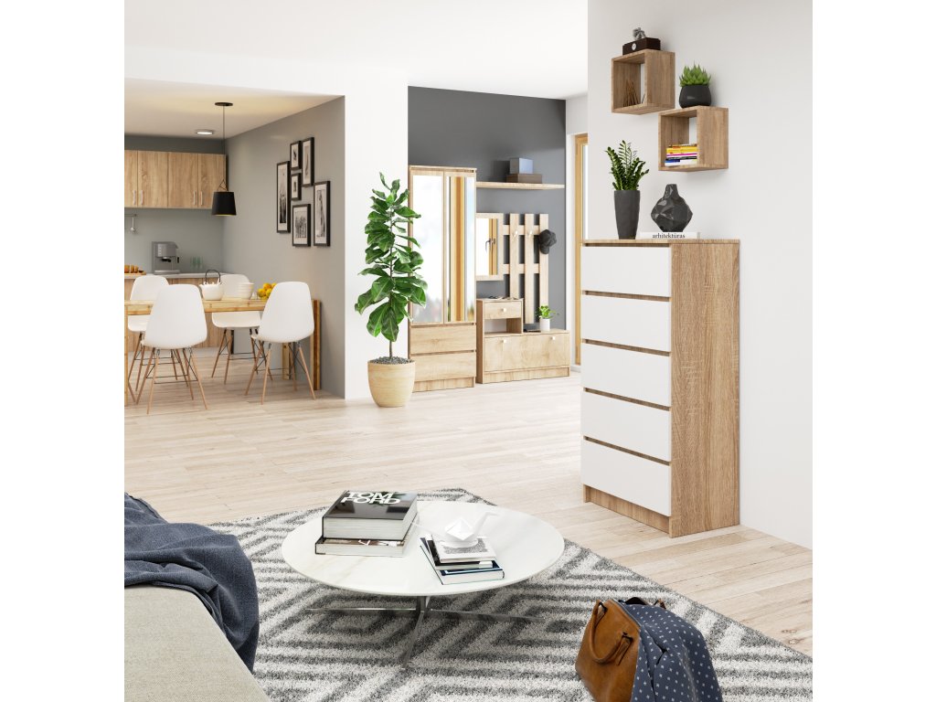 - Barva: Teplý odstín dubu Sonoma doplněný čistou bílou