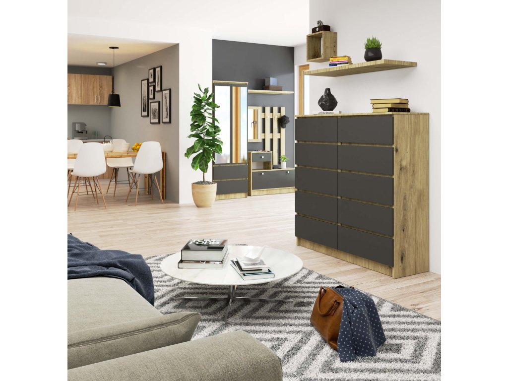Uvítajte v svém interiéru komodu, která redefinuje moderní design. LIDUŠKA120, nádherná skříňka s dokonalým sladěním dubu Artisan a grafitu, je stvořena tak, aby dodala vašemu domovu šmrnc, a zároveň vám poskytla praktické úložné prostory.