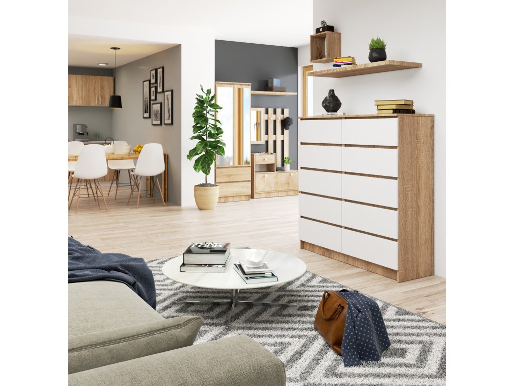 Komoda LIDUŠKA120 je ideálním řešením pro ty, kdo hledají funkční nábytek s výrazným designem. Díky kombinaci dubu Sonoma a bílé barvy se dokonale hodí do moderních ložnic i obývacích pokojů, kde bude dominovat svým vzhledem a praktičností.