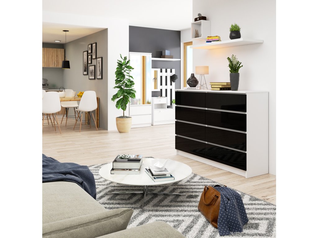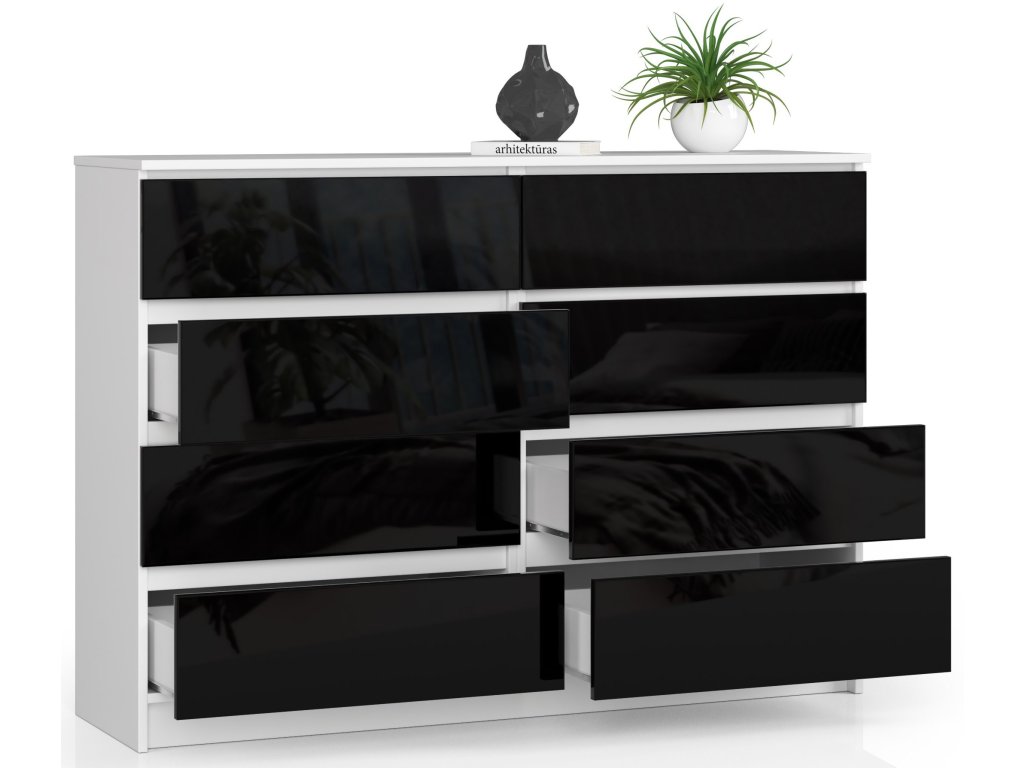 SAMUEL140 není jen komoda. Je to umělecký kousek, který přináší luxusní a moderní atmosféru do vašeho interiéru. Černý lesk na bílém pozadí zajišťuje, že tento kousek nábytku bude vždy středem pozornosti. Dejte svému domovu ten správný vzhled s komodou SAMUEL140!