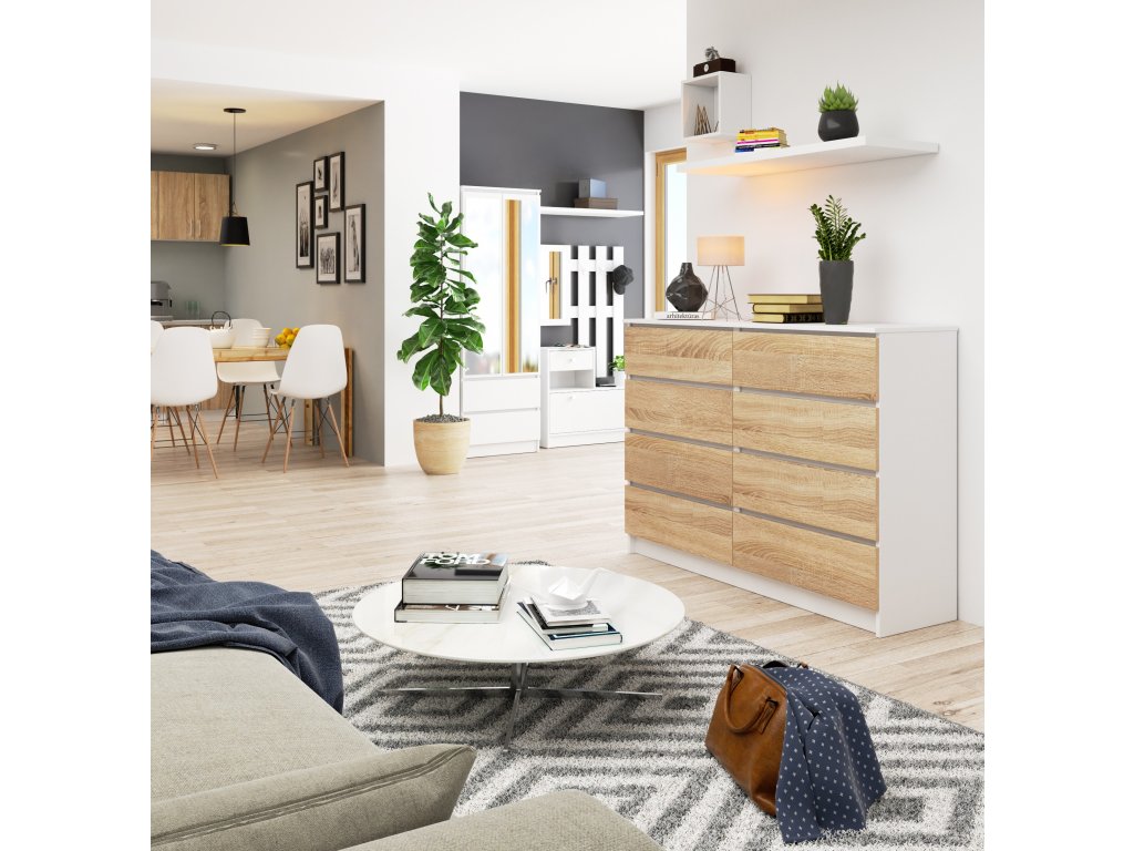 Potřebujete moderní a zároveň praktický kus nábytku do svého domova? Představujeme SAMUEL140 - komodu, která kombinuje jednoduchou bílou s teplým tónem dubu Sonoma.
