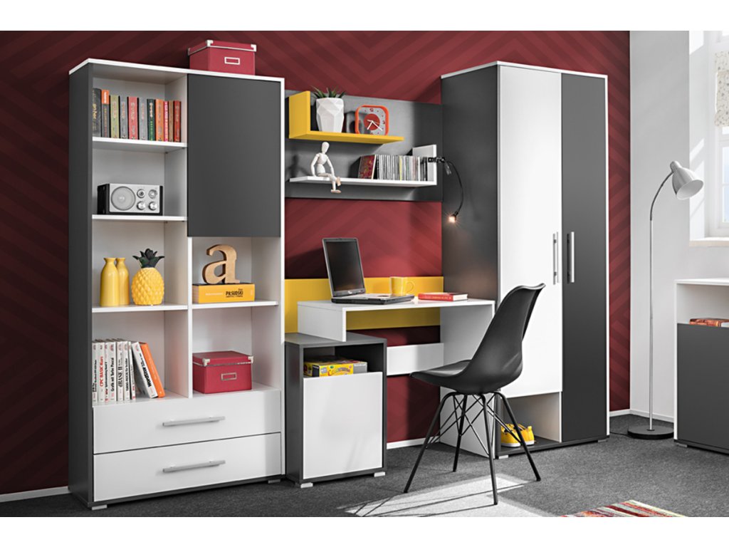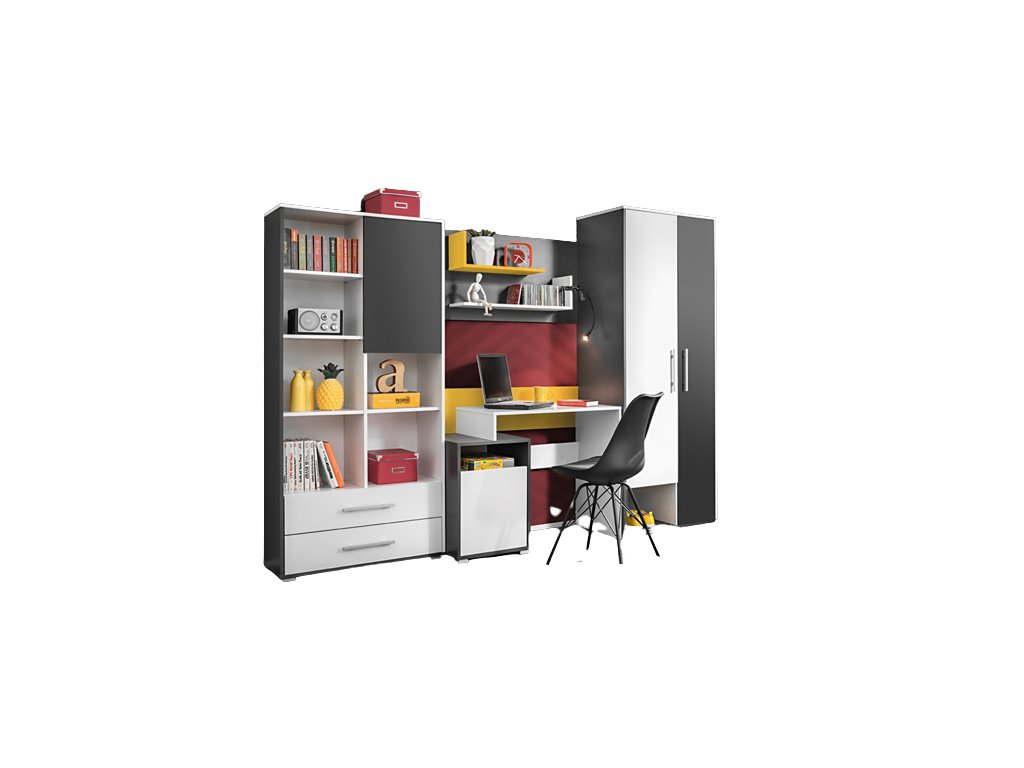 Barevné provedení stěny je v žádaném kontrastu bílá, šedá. Dětský pokoj je poskládaný z více prvků. Zakoupit lze pouze jako celek.