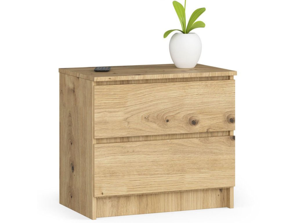 Pro ty, kdo hledají spojení funkčnosti a moderního designu v interiéru ložnice, je noční stolek KARIN60 ideální volbou. S jeho dokonale zpracovaným odstínem dubu Artisan přináší příjemnou a teplou atmosféru každé ložnici.