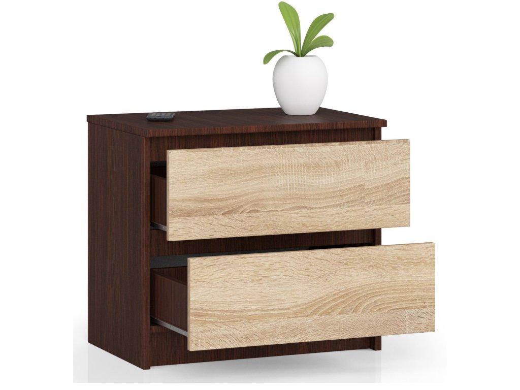 Představujeme vám KARIN60, noční stolek, který kombinuje temné tóny wenge s elegantním dubem Sonoma. Ideální volba pro ty, kteří chtějí přidat nádech moderní elegance do své ložnice.