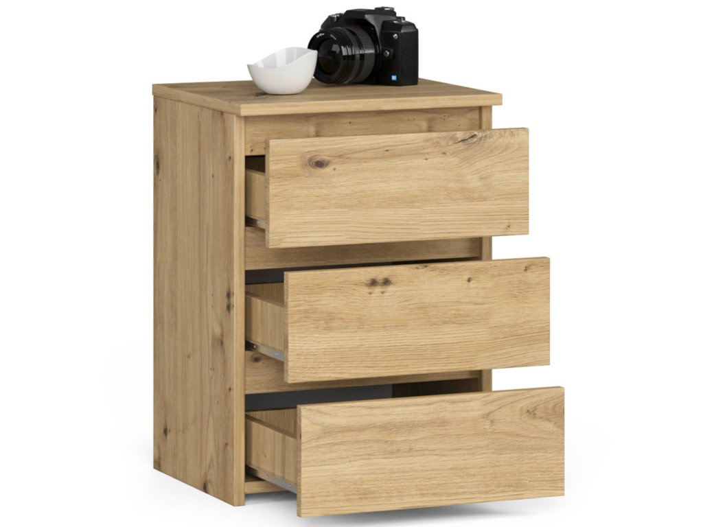 Noční stolek SHEEN40 je vyroben z vysoce kvalitního materiálu LTD, což zaručuje jeho dlouhou životnost a snadnou údržbu. Tři zásuvky poskytují dostatek úložného prostoru pro vše, co potřebujete mít při ruce v ložnici. Funkce tichého dovírání zase zajišťuje, že vaše noci budou klidné a bez zbytečných rušivých zvuků.