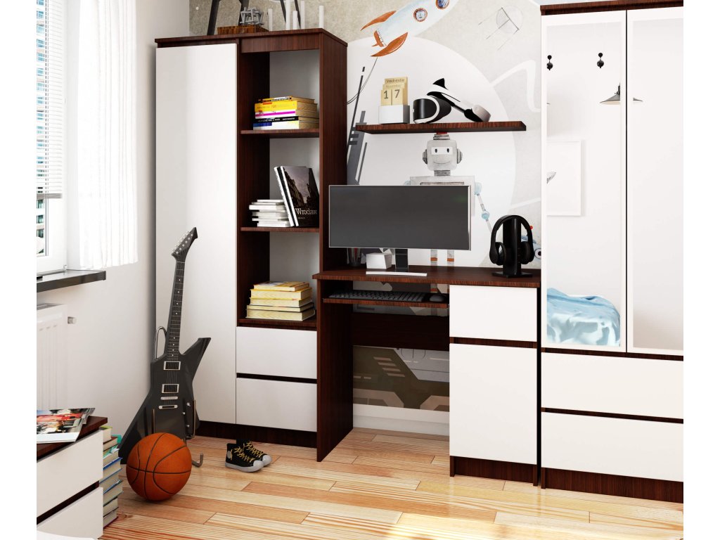Objevte PIXEL90P, psací stůl, který v sobě snoubí moderní design a praktičnost. Elegantní kombinace barvy wenge a čistě bílé přináší sofistikovaný vzhled vhodný pro každý interiér.