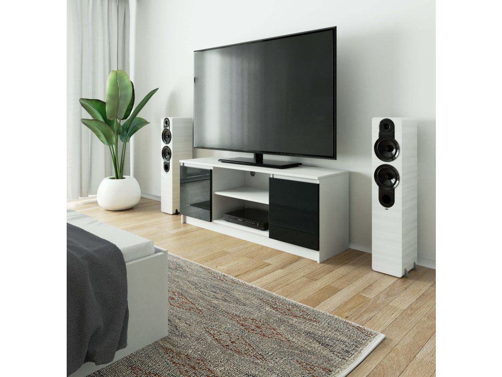 TV stolek ROMANA140 představuje perfektní spojení čistě bílé barvy s hlubokým grafitovým leskem. Tento designový kousek je ideálním doplňkem pro moderní obývací pokoje, kde hledáte elegantní, ale praktické řešení.