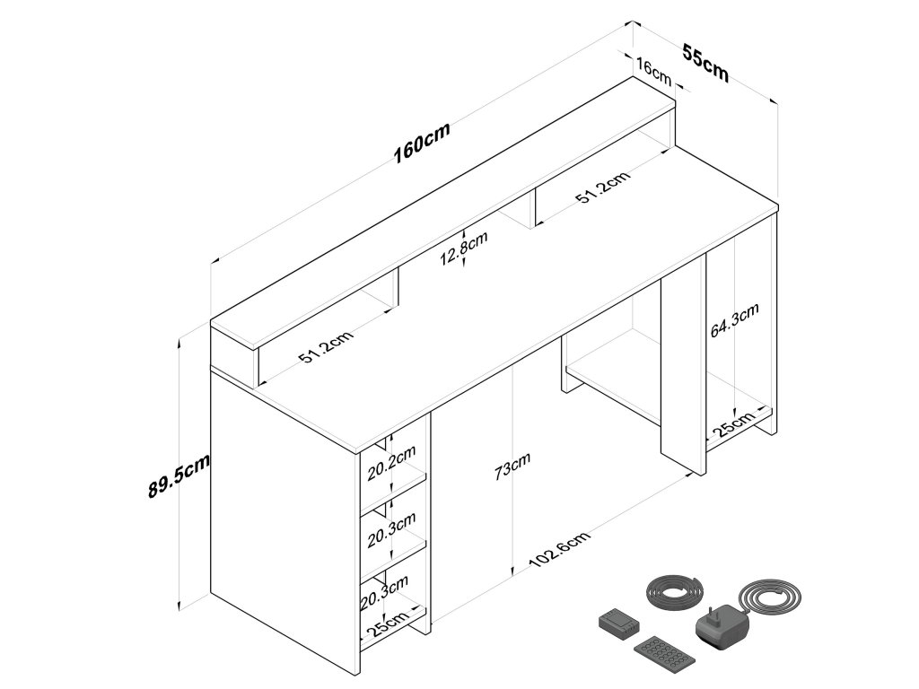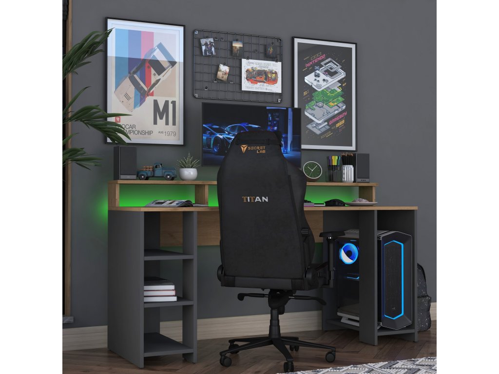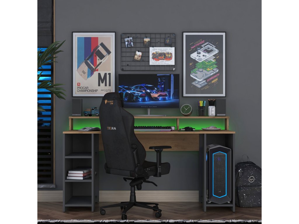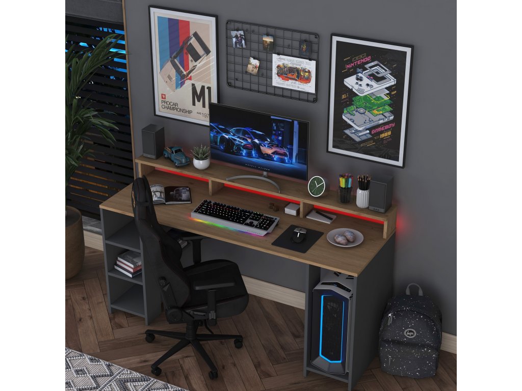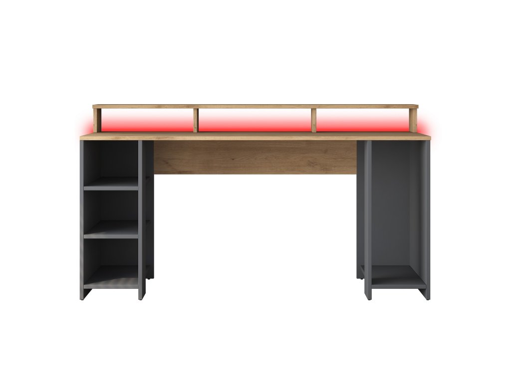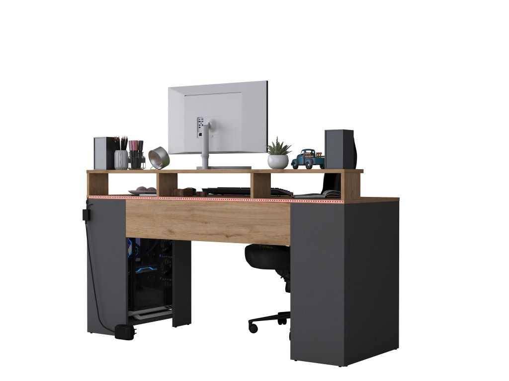Stůl DESK poskytuje dostatek prostoru pro pohodlnou práci, studium nebo hraní. Díky integrovanému kontejneru na PC a praktickému regálku budete mít vše potřebné po ruce a přitom udržovat pracovní prostor organizovaný. Odolné materiály, jako je melamin a VT laminát, zajišťují snadnou údržbu a dlouhou životnost.