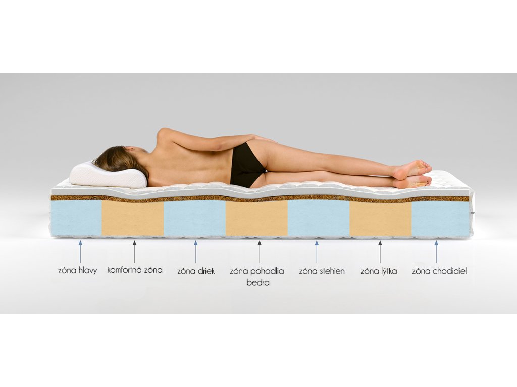 Nosnou střední část jádra tvoří kvalitní PUR pěna T25 vyšší tuhosti o tloušťce 10 cm. Z jedné strany je obklopena kokosovou vrstvou v tloušťce 1cm a 2cm PUR pěnou T25, druhou stranu tvoří PUR pěna T 25 v tloušťce 2 cm. Výška matrace: 17 cm.