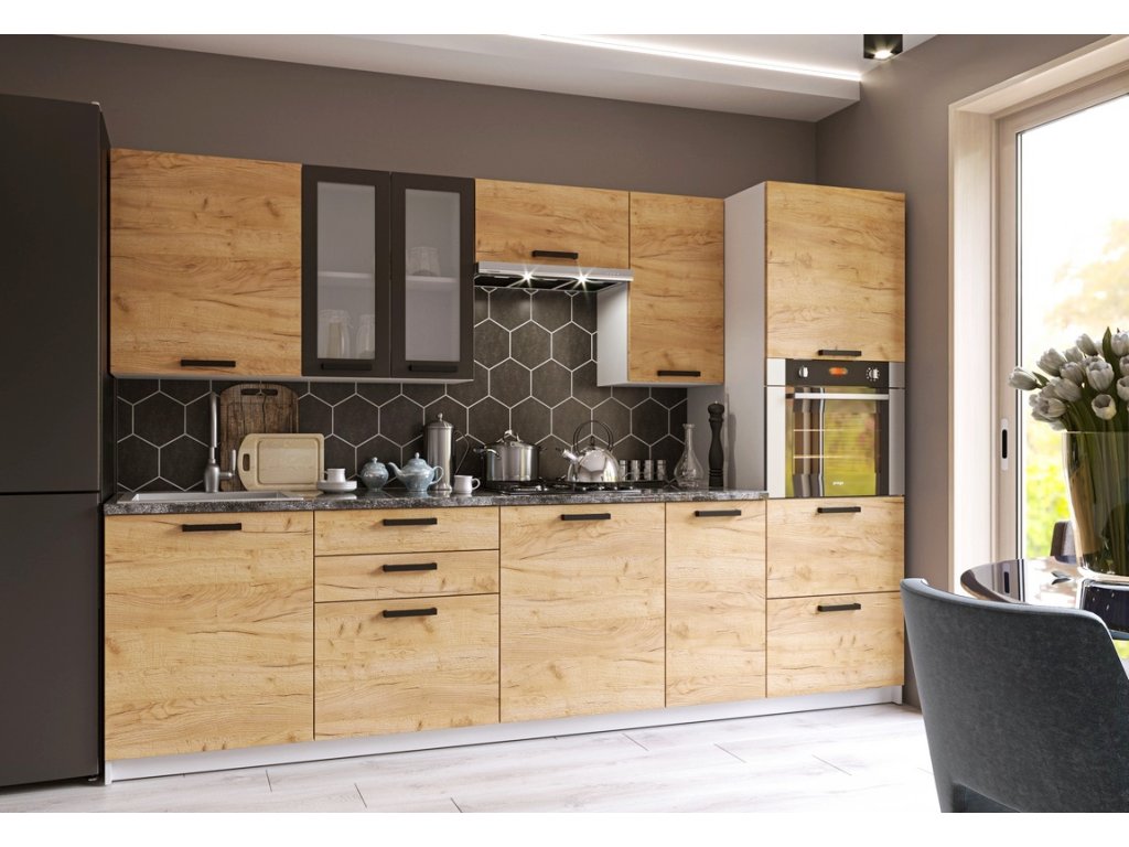 Moderní kuchyňská sestava DOROTA Vás osloví specifickým barevným designovým provedením v kombinaci barev dub Kraft zlatý/bílá, která dodává sestavě šmrnc a výjimečnost. Jednotlivé skříňky lze libovolně umístit, takže si můžete zvolit variantu, která vyhovuje Vašim představám. Barva korpusu je bílá. Černé plastové úchyty vytvářejí příjemný barevný kontrast. Zásuvky mají teleskopický výsuv. Přední a boční sokl není součástí kuchyně, je třeba jej doobjednat.