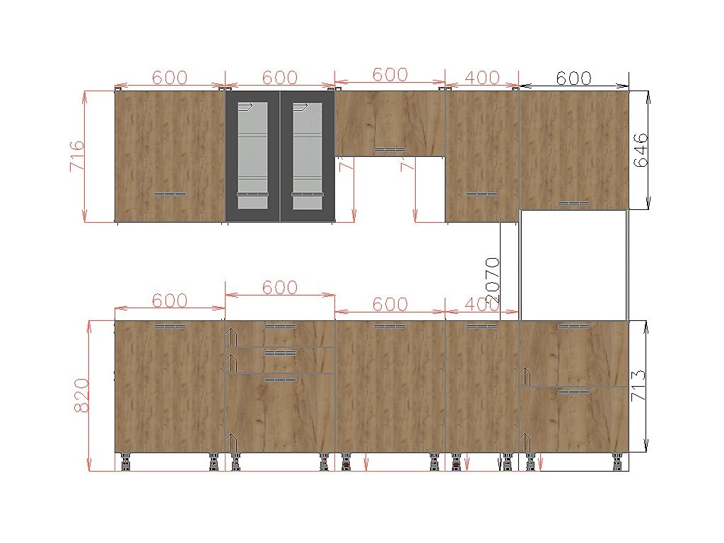 | Sestava obsahuje: | 1 ks horní skříňka 60 cm, 1 ks horní digestořová skříňka 60 cm, 1 ks horní prosklená skříňka 60 cm, 1 ks horní skříňka 40 cm, 1 ks vysoká skříňka na vestavný spotřebič, 2 ks dolní skříňka 60 cm, 1 ks dolní skříňka se zásuvkami 60 cm, 1 ks dolní skříňka 40 cm |