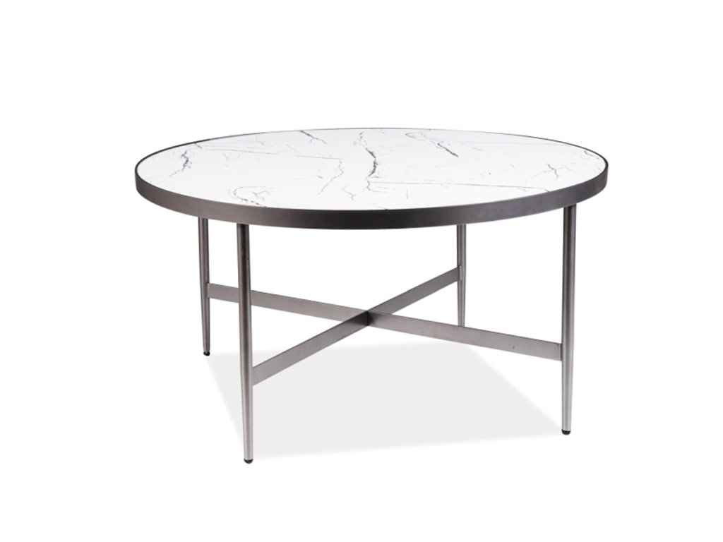 Elegantní konferenční stolek DOROTA je navržen v moderním designovém provedení. Zaujme stylová konstrukce i provedení desky s efektem mramoru. Konstrukce a rám stolku je vyroben z kovu, deska stolu je v kombinaci. "> MDF desky a dýhy. Barevné provedení je bílá/šedá, s efektem mramoru. Tvar desky je kulatý o průměru 80 cm. V naší nabídce naleznete tento stolek is průměrem 50 cm. Výška stolku je 42 cm.