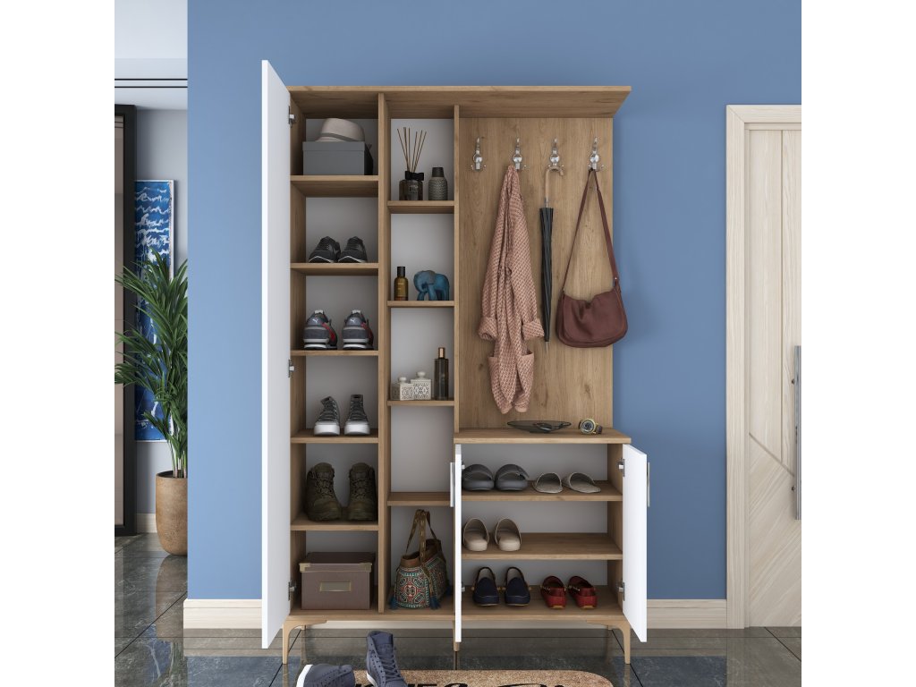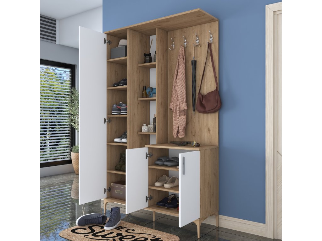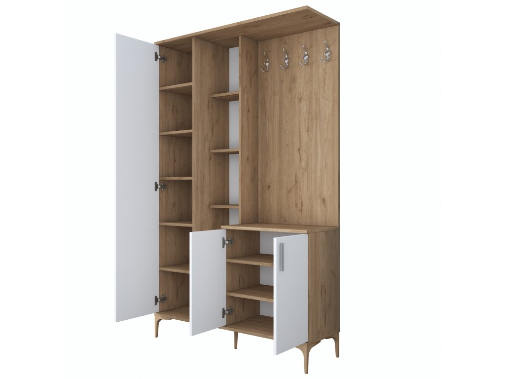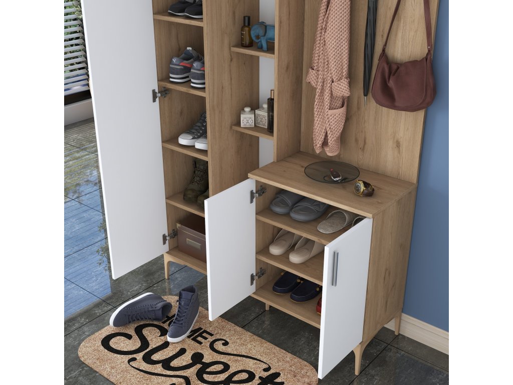 Předsíňová sestava DRAGON kombinuje funkčnost a styl v jednom. Díky modernímu bílému provedení v kombinaci s ořechovým dekorem přináší do vaší předsíně sofistikovaný vzhled a zároveň dostatek úložného prostoru pro každodenní potřeby.