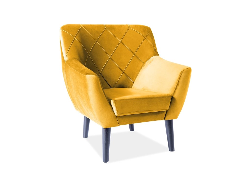 Je čalouněno kvalitní sametovou látkou Bluvel 68 ve žluté barvě. Ke křeslu si můžete dokoupit také pohovku DULON, kterou naleznete v naší nabídce. Křeslo má vysoké dřevěné nožičky, které jsou v barvě wenge.