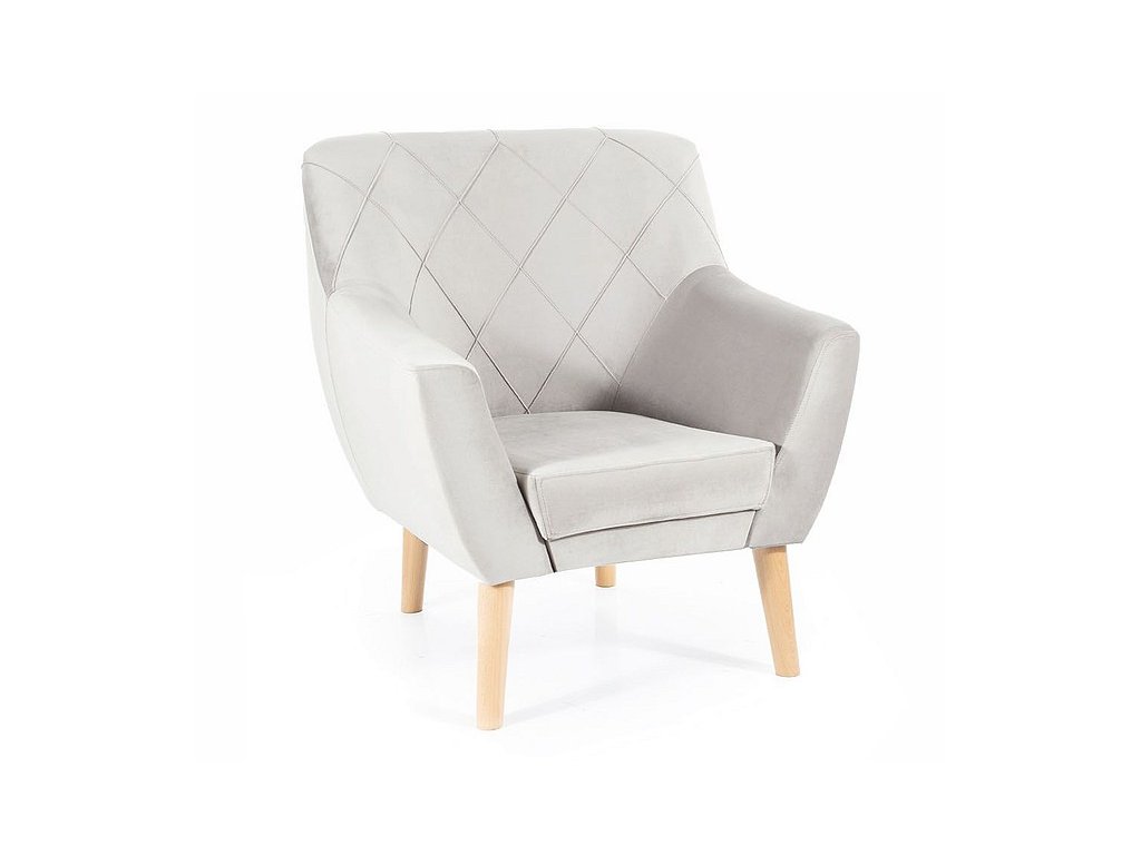 Je čalouněno kvalitní sametovou látkou Bluvel 03 ve světle šedé barvě. Ke křeslu si můžete dokoupit také pohovku DULON, kterou naleznete v naší nabídce. Křeslo má vysoké dřevěné nožičky, které jsou v barvě buk.