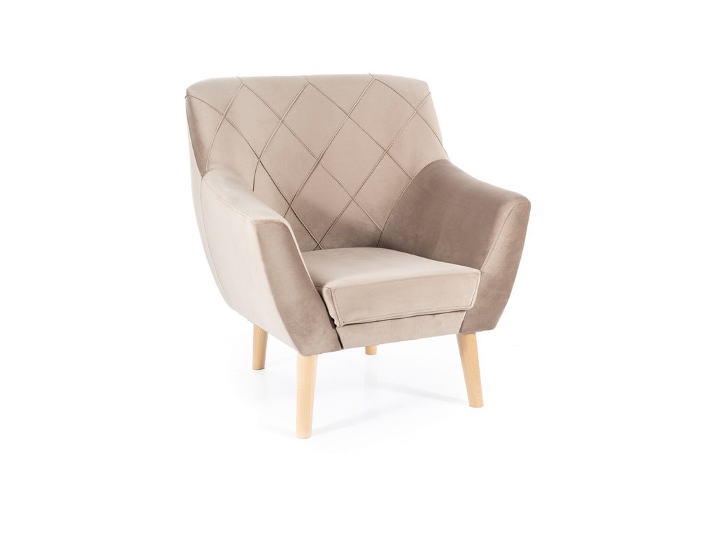 Je čalouněno kvalitní sametovou látkou Bluvel 40 v tmavě béžové barvě. Ke křeslu si můžete dokoupit také pohovku DULON, kterou naleznete v naší nabídce. Křeslo má vysoké dřevěné nožičky, které jsou v barvě buk.