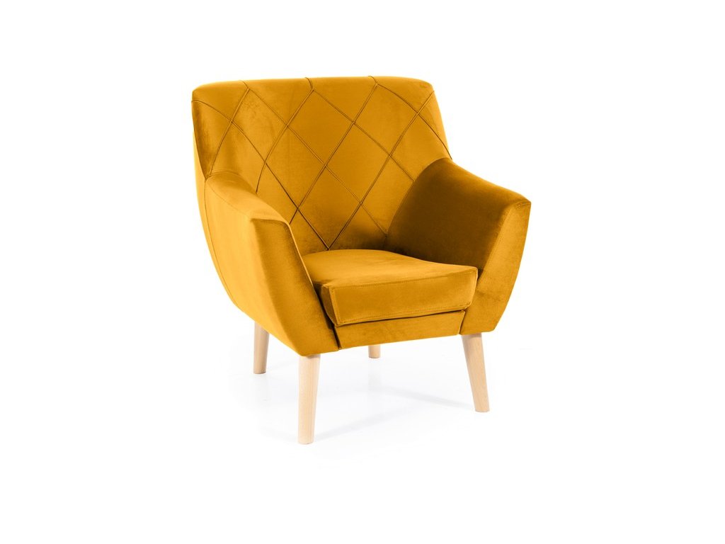 Je čalouněno kvalitní sametovou látkou Bluvel 68 ve žluté barvě. Ke křeslu si můžete dokoupit také pohovku DULON, kterou naleznete v naší nabídce. Křeslo má vysoké dřevěné nožičky, které jsou v barvě buk.