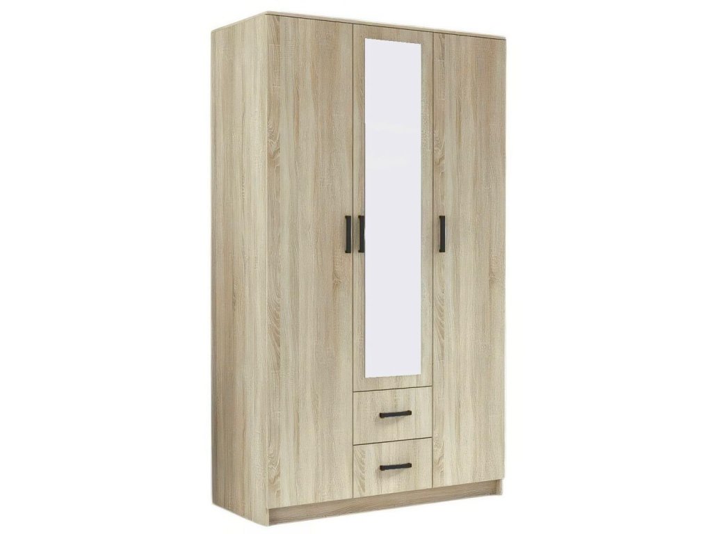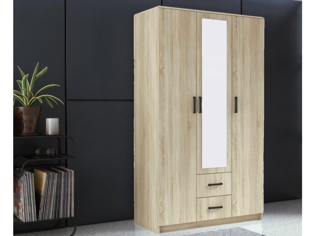 EASY je jednoduchá třídveřová šatní skříň se dvěma zásuvkami a zrcadlem. Díky svým rozměrům se vejde i do malých prostor. Vnitřní rozložení nabízí čtyři police, závěsnou tyč a dvě zásuvky. Díky výšce 205 cm získáte dostatek úložného prostoru. Je vyrobena z kvalitní LTD desky.