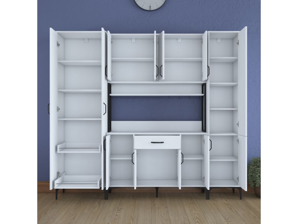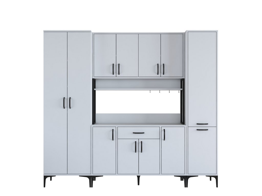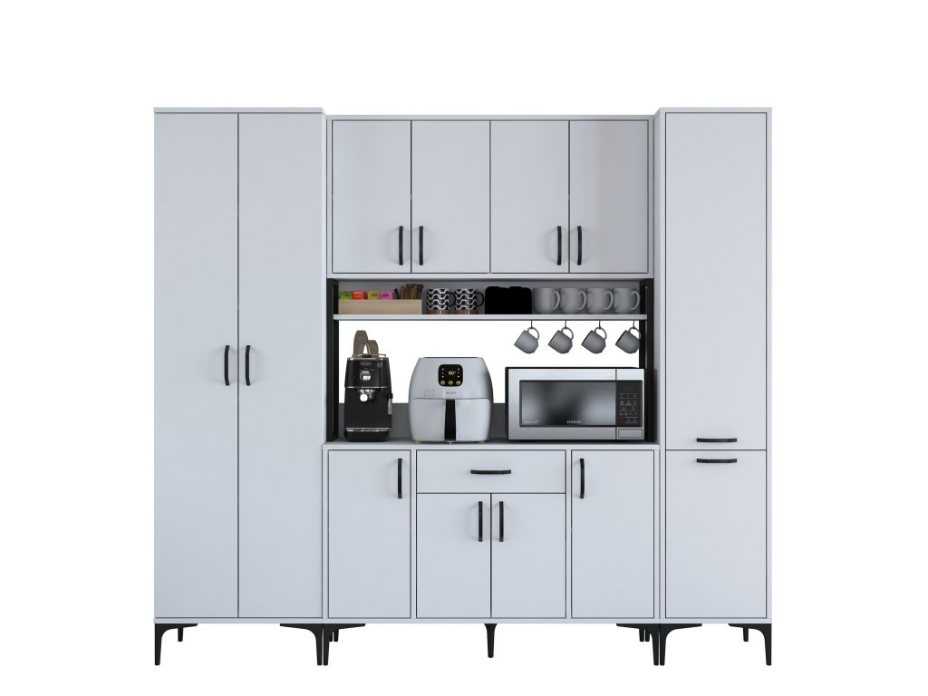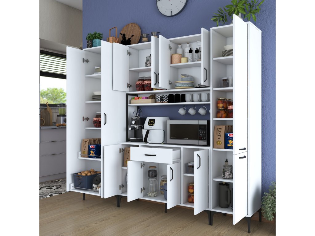 Skříň ELECTRIC je navržena tak, aby poskytovala maximální úložný prostor. Obsahuje deset plných dvířek, jednu zásuvku a praktický regálek, který je ideální pro umístění mikrovlnné trouby nebo dalších kuchyňských spotřebičů. Její víceúčelový design vám umožní efektivně organizovat nádobí, kuchyňské potřeby i další příslušenství.