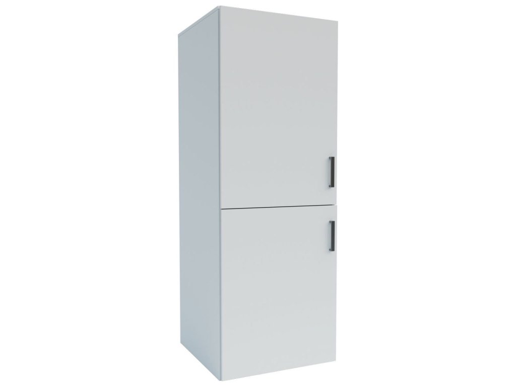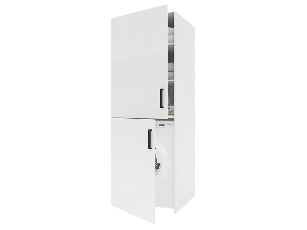 Zajímavě řešená skříňka na pračku představuje praktické řešení, jak využít úložný prostor nad pračkou a držet v něm čistící prostředky a koupelnové doplňky pěkně uspořádané v policích za dvířky mimo dohled.